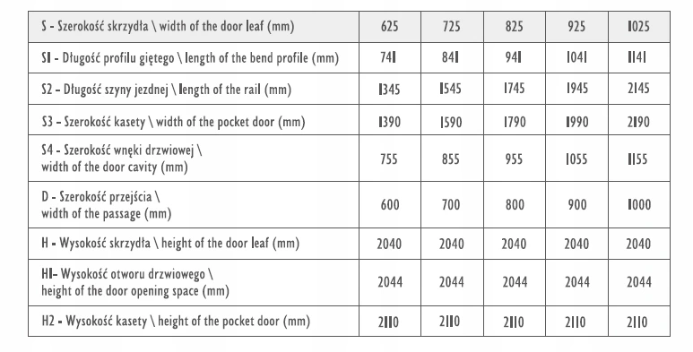 Rozmiar skrzydła 60-100cm (nw zależności od wyboru), wysokości 2040 mm, bez progu