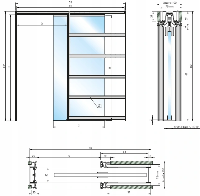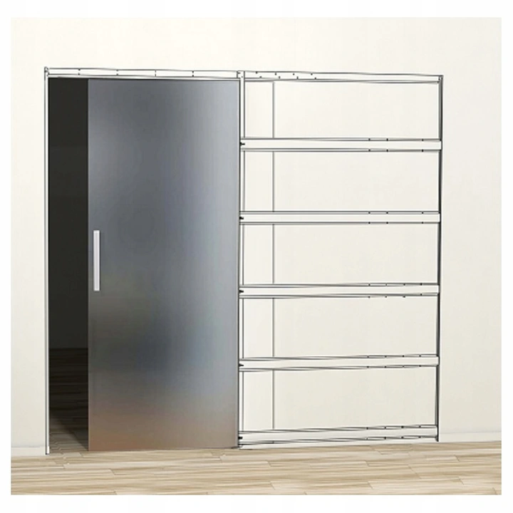 Skład systemu/kasety: konstrukcja (stelaż), szyna jezdna aluminiowa, komplet okuć łożyskowanych 100kg, komplet wkrętów, instrukcja montażu.
