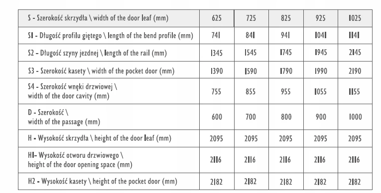 Rozmiar skrzydeł – 60-100cm (w zależności od wyboru), wysokości 2095 mm, bez progu